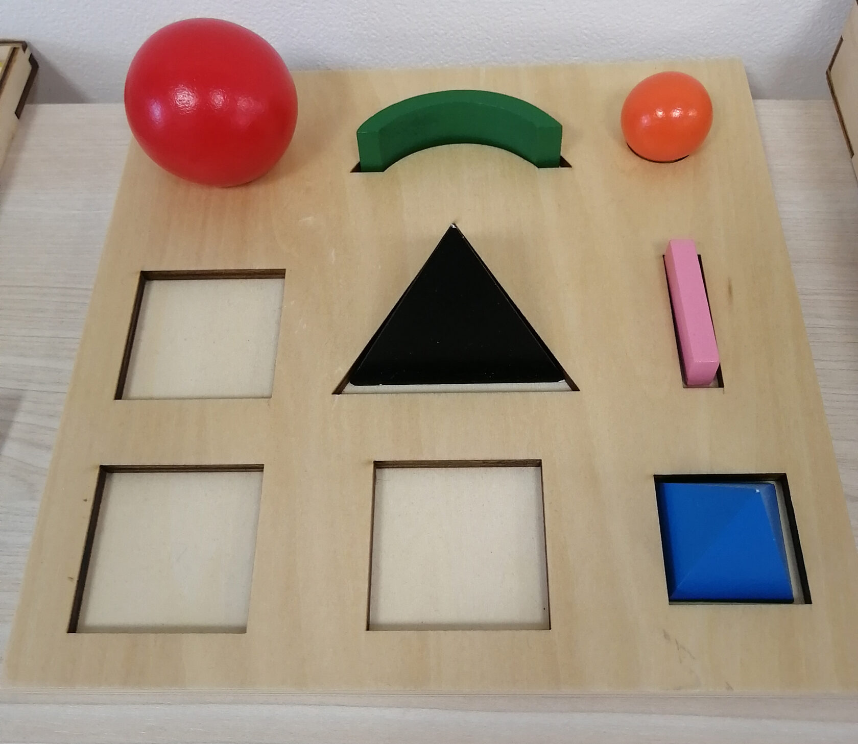 Геометрия – интереснейшая область в Монтессори-классе. Наглядные деревянные формы используются для овладения терминологией всех плоских и объёмных фигур. Сравнительные карточки необходимы, чтобы ввести типы и расположение линий, виды и позиции углов, особые характеристики геометрических фигур.